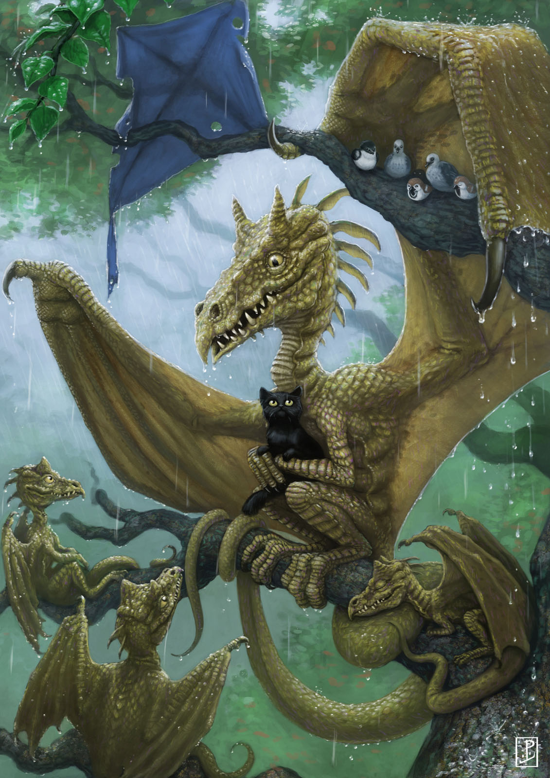 Modern Dragons are great story tellers and they pass on their wisdom to the next generation through riddles, puzzles and tales. Tales of how they survived the onslaught of kings, knights, would-be heroes and the the dreaded poacher. Cats seem to be the accessory of choice for many dragons, after all it’s always useful to have your favorite minion on hand. Some dragons love water. others prefer to try and keep dry.